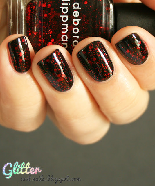 Je vais être franche, je l'aime mais la texture est merdique. C'est un jelly noir parsemé de paillettes rouges de deux tailles différentes mais le vernis est tellement fin que les paillettes se répartissent très mal et deviennent rugueuses. Et il met des heuuuures à sécher.